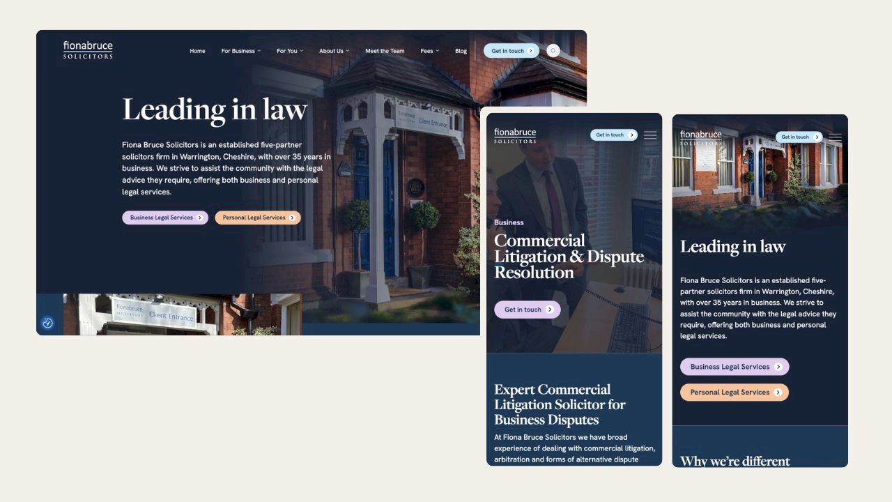 Fiona Bruce Solicitors is a respected legal firm based in Warrington, Cheshire, with over 35 years in business. After ten years with us as their digital marketing partner, it was time to refresh their website. Their existing Squarespace site had become restrictive – particularly in terms of design flexibility and mobile usability, which was a key concern as noted by partner Phil Porter. They also wanted better content management and SEO control. With a broad range of legal services and strong existing search rankings, the site needed to be not only professional and trustworthy but also user-friendly and SEO-optimised.